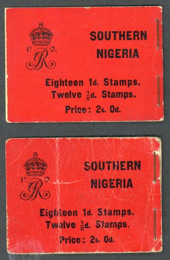 1912 2/- booklet, stapled at right, two examples, the first with ½d. pane (less one stamp) and two 1d. panes (one less one stamp) and two pages of interleaving damaged, with very fresh cover; the second with one pane of ½d. and two panes of 1d. (one less 2 stamps), the interleaving is complete but the cover creased and soiled. (2 booklets)