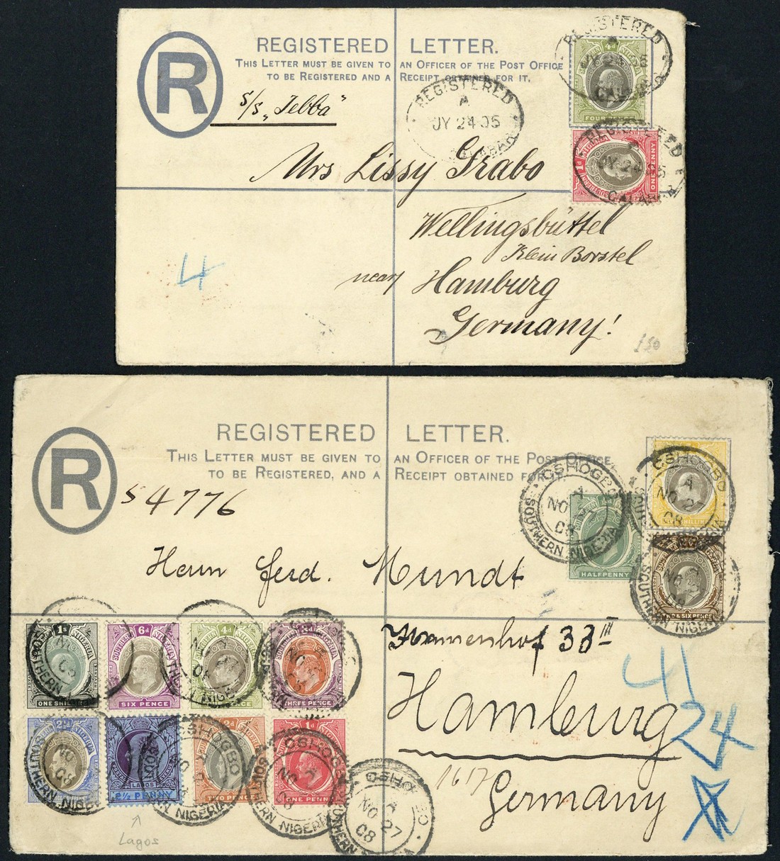 A collection of K.E.VII and K.G.V in stock album which includes 1902 size G, head A overprinted "specimen" for U.P.U., also head B (from 1907) with handstamp "specimen" in violet (Samuel SN1, minor soiling but rare), unused with both head types and showing the colour of the lettering ranging from grey to blue, an extensive group of used (16) showing a variety of oval and boxed registered handstamps including Aboh (scarce), Forcados, Warri (2), Ibadan, Burutu, Oshogbu and one cancelled by barred ovals; size H unused (2) and used (5) including Degema registered oval, Oshogbo c.d.s. and size H2 unused; 1912 size G used, size H Specimen, unused (2) and used with Degema registered label. Generally good to fine making a very interesting and useful collection with some very early dates of used of some of the registration markings. (37 covers)