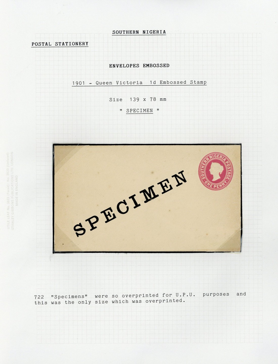 A general collection mounted on leaves with envelopes size a handstamped "specimen", unused and used (2), size b unused and used (4) including uprated and taxed, size c registered to Germany; Post Cards with 1900 Specimen and used, 1903 1d. Specimen and the rare handstamp "specimen" type SN1 in violet (R.P.S. Cert.) and used (4), 1908 ½d. provisional Specimen, unused and used (3), one with straight-line "too-late" and Siloko postmark, 1908 ½d. Specimen (2) and used (3), one with German Seapost oval; Registered envelopes with 1901 size G Specimen, unused and used and size H2 used. A clean and attractive lot. (38 covers). Photo