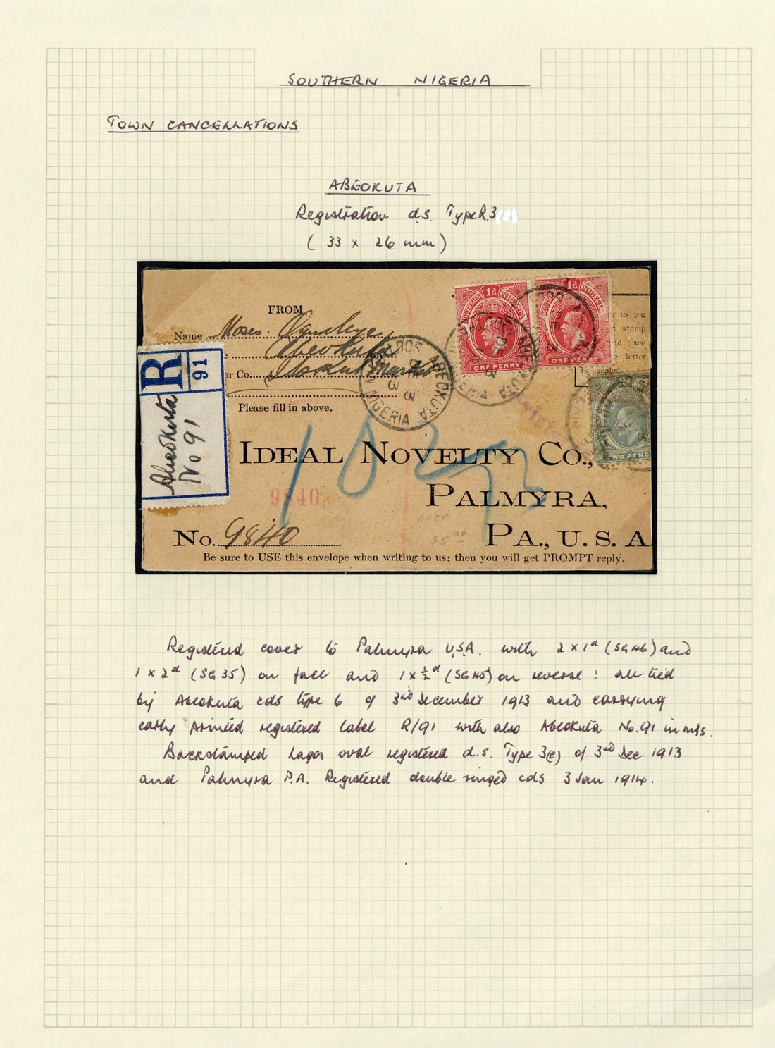 A small group with 1911 postcard to Abeokuta bearing a good strike of type D3 arrival, 1913 and 1915 envelopes registered overseas, the first with manuscript registration label, the second with printed label; also photo postcard of the town