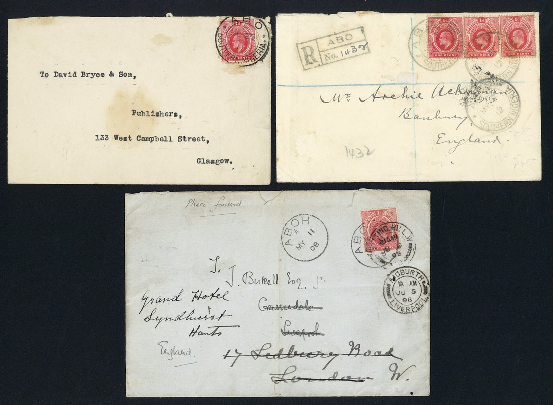 1912 (12 May) envelope registered to Banbury, bearing K.E.VII 1d. (3) tied by good strikes of type D4 "abo" c.d.s. with a fine strike of the boxed registered handstamp at left (scarce); slight soiling on the reverse; scarce. Also 1908 envelope to England cancelled by type D2 c.d.s. and 1911 envelope to Glasgow with 1d. franking tied by type D4 c.d.s. (3 covers)