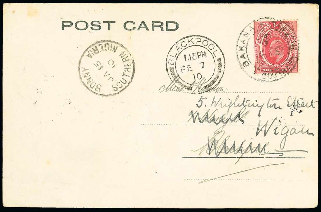 1910 (15 Jan.) picture postcard of Addah river, addressed to England and bearing K.E.VII 1d. tied by a good strike of type D4 c.d.s., with Bonny and Blackpool transits alongside. A scarce postmark. Photo