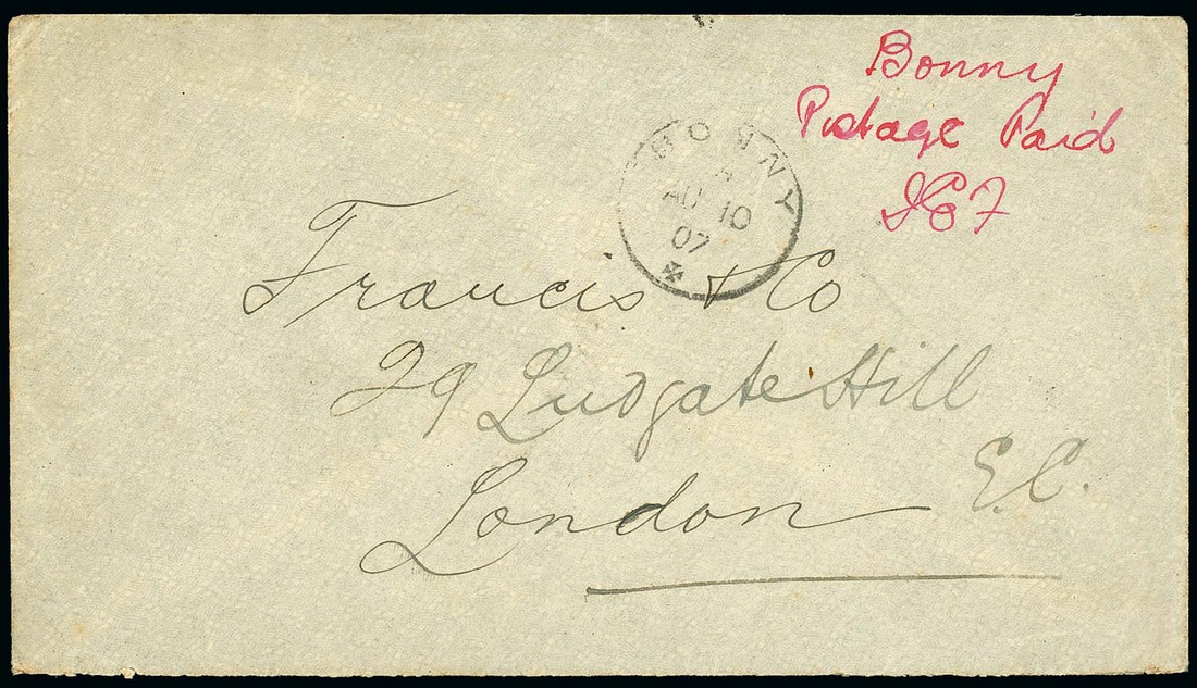1907 (10 Aug.) stampless envelope to London with manuscript "Bonny/Postage Paid" in red ink and initialled by the postmaster and with a light strike of type D5 c.d.s. alongside, the reverse with London arrival. The supply of low value stamps became exhausted in August 1907. Scarce and desirable. Photo