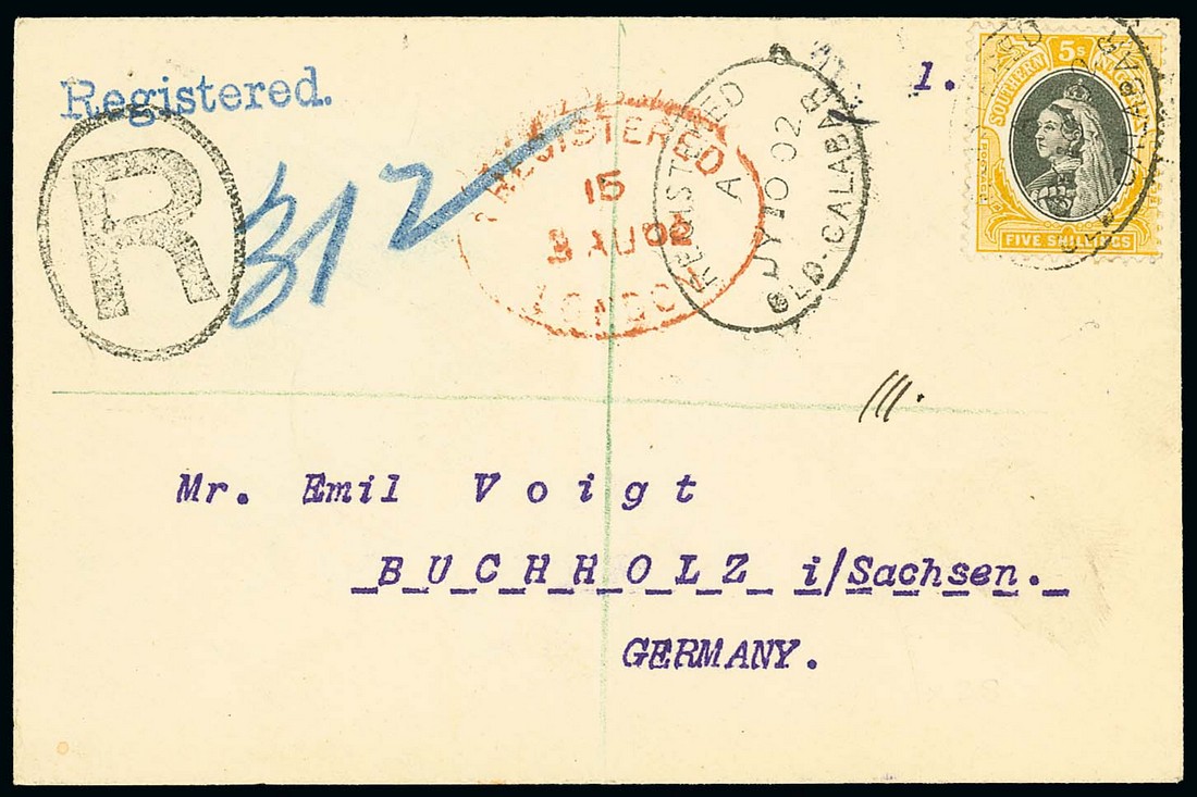 1902 (10 July) envelope registered to Germany, bearing 1901 5/- tied by Old Calabar registered oval, with large "R" in oval at left and London Registered oval in red; vertical folding crease. Photo