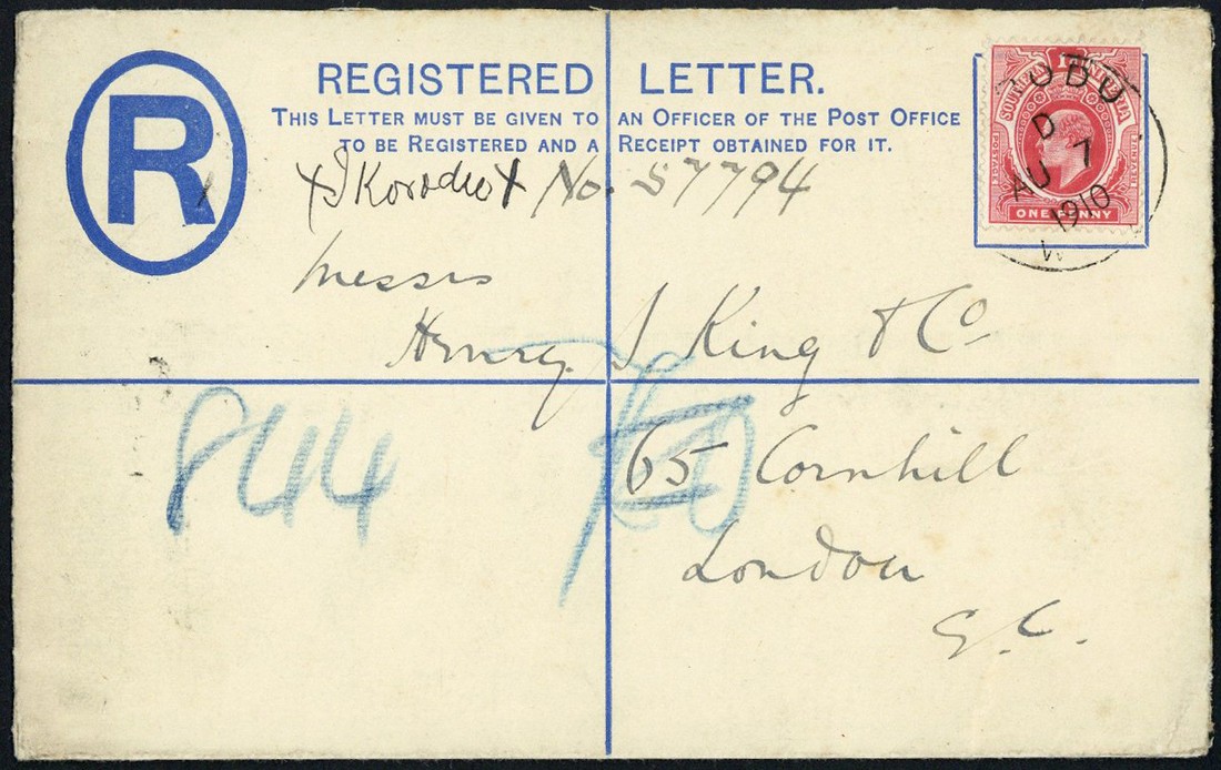 1910 (7 Aug.) opened-out 2d. registered envelope to London, uprated with 1d, cancelled by type D3 c.d.s. with manuscript registration details written on front; the reverse with a very fine strike of the despatch c.d.s., Lagos registered oval and London registered c.d.s. Fine and unusual