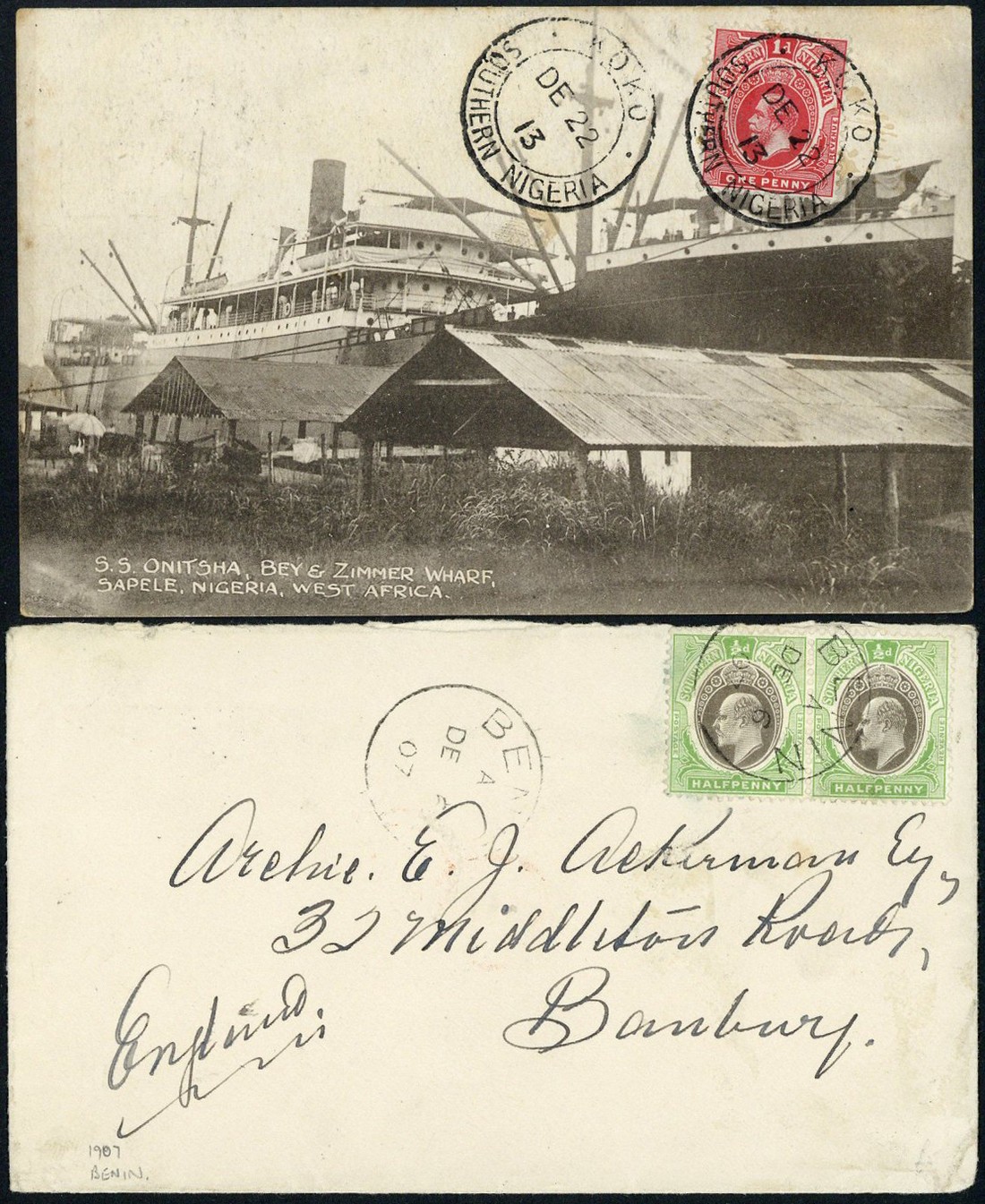 1903-13, a group of covers and cards with Benin River c.d.s. on local 1d. stationery card, a fine strike of type D5 c.d.s. cancelling ½d/ pair on envelope to Banbury, and examples of the type 6 "koko/southern nigeria" c.d.s. on stationery (2) or picture post cards (3)