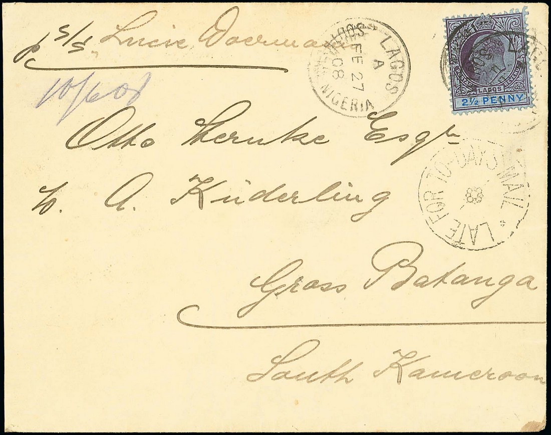 1908 (27 Feb.) envelope from Lagos to Batanga Cameroon, marked "p S/S ucie Woermann", bearing Lagos 1905 2½d. and showing very rare "late for today's mail" circular h.s. (Type I11) with, on reverse, Kribi transit datestamp. Two examples recorded. Photo
