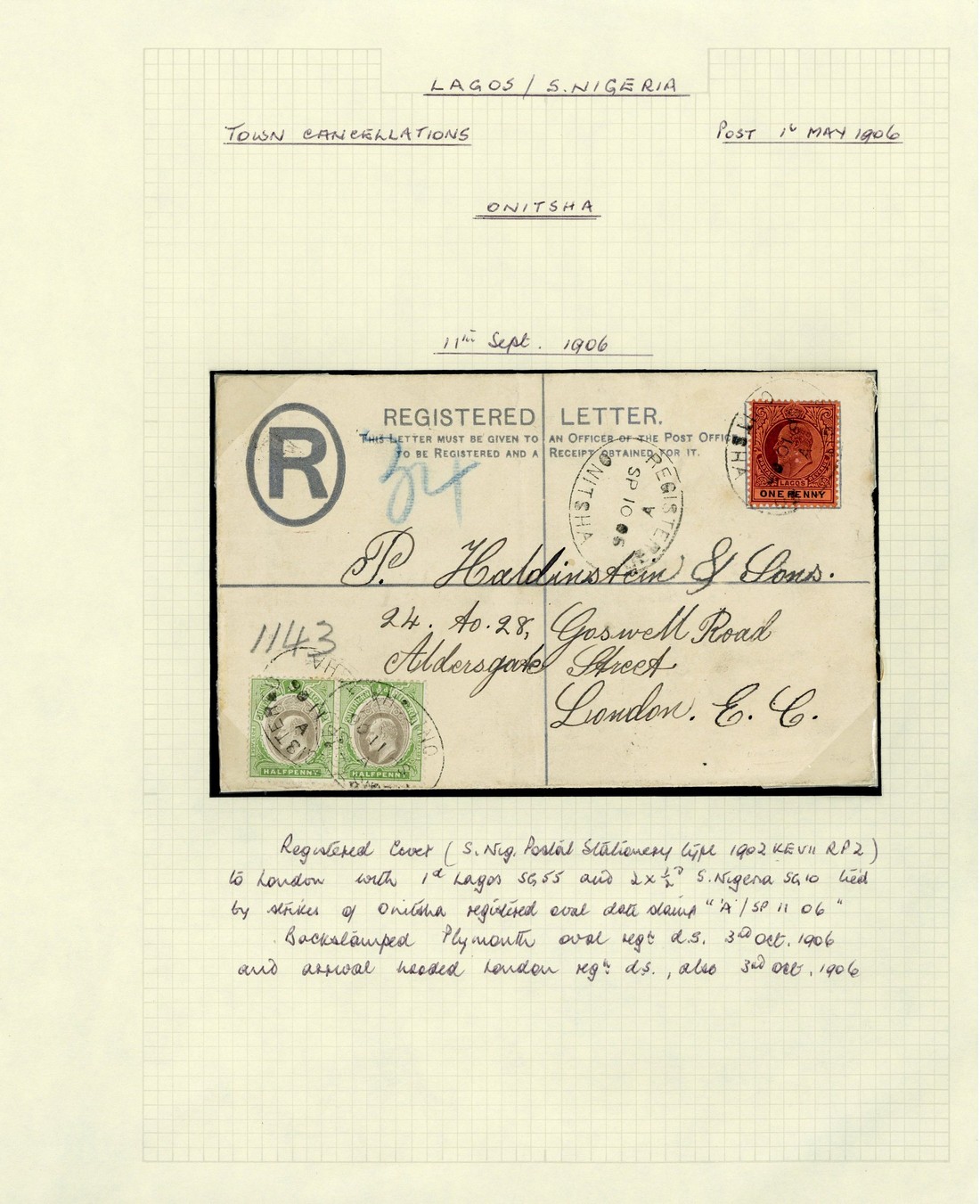 1906 (10 Sept.) 2d. registered envelope to London, uprated mixed 2d. franking and cancelled by good strikes of type R1 registered ovals; 1907 (8 Nov.) envelope to Belgium with mixed 2d. franking tied by very fine strikes of the type D2 c.d.s.; also a later envelope to London with 1d. tied by type D3 c.d.s. (3 covers)