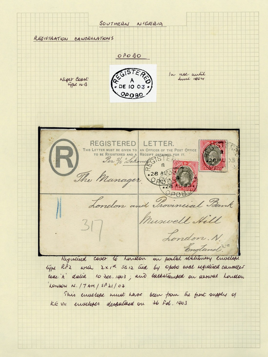 1903-09, a good group of coves with a range of postal markings including 1903 registered envelope to London cancelled by good strikes of the Opobo R2 registered oval, 1906 registered envelope to Manchester uprated with Lagos 1d. cancelled by Egwanga type R3 registered oval; 1907 envelopes to Birmingham cancelled by Egwanga type D6 c.d.s. and Opobo type D7 c.d.s. (2); plus 1909 envelope to U.S.A. with 4½d. franking cancelled by Aba c.d.s. and showing a good strike of Opobo type R9 registered handstamp. (6 covers)