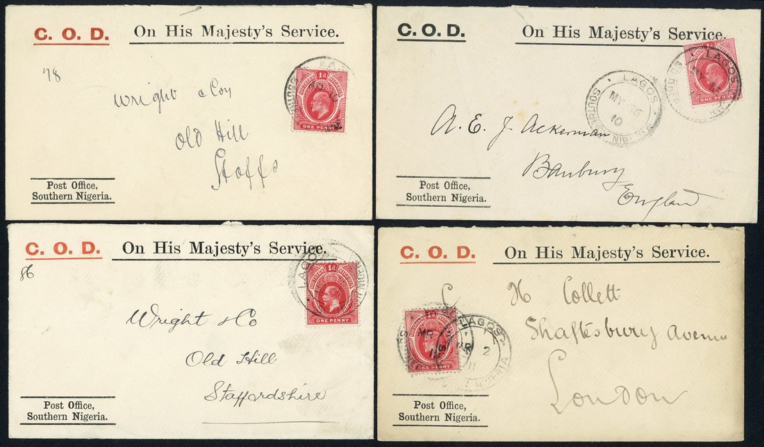 1910-14, a group of envelopes showing variations in the printing with large size showing "c.o.d." in black and the smaller size (3) showing the "c.o.d." in red; good to fine. A scarce group. (4 covers)