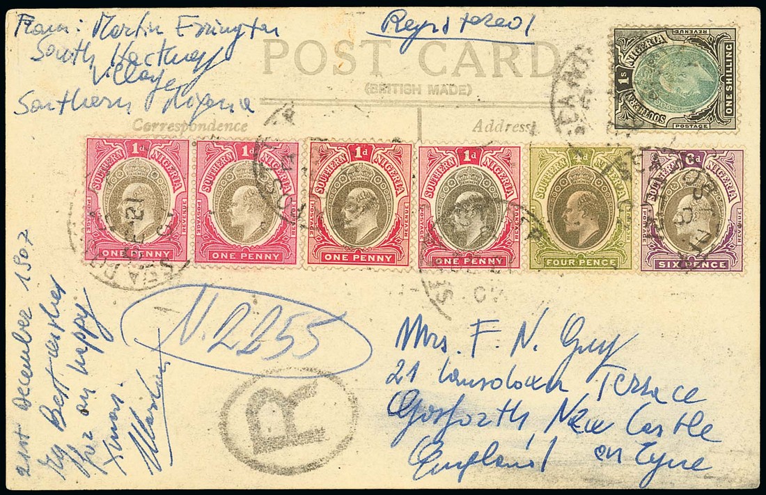 1907 (21 Dec.) real photo picture post card of local street scene registered from South Itectwey (?) Village to Newcastle on Tyne bearing 1d. (4), 4d., 6d. and 1/- tied by fair strikes of "sea post dep" code "B" c.d.s. with large "R" in oval alongside; a rare marking. Photo