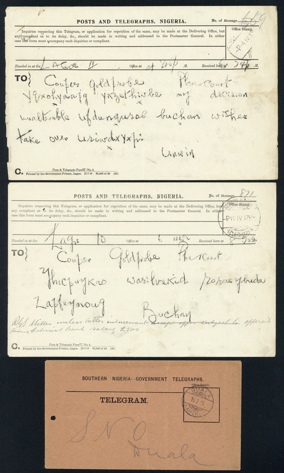 1915-17, a small group with Southern Nigeria Telegram cancelled by "duala/kamerun" c.d.s., also two telegrams from Lagos cancelled by the "P - H" telegraph datestamp of Port Harcourt. Interesting group