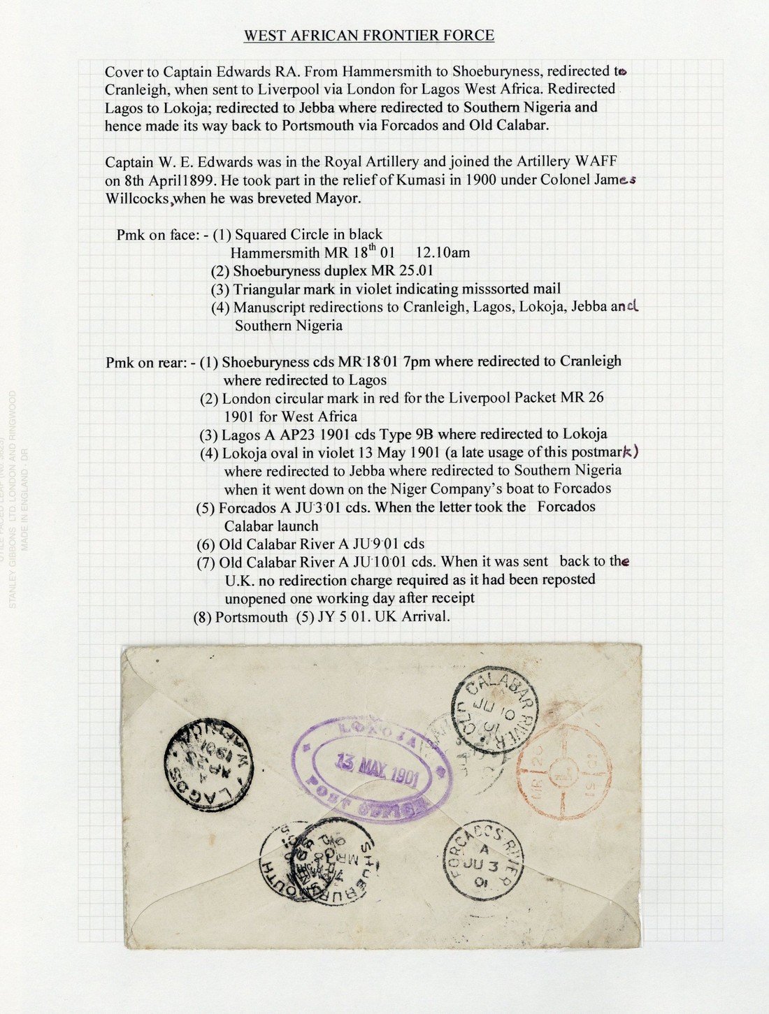 1901 (18 Mar.) envelope from Hammersmith addressed to Capt. Edwards RA at the Scholl of Gunnery at Shoeburyness, bearing ½d. green pair, showing Triangle mark in violet indicating mis-sorted mail and manuscript redirects for Cranleigh, Lagos, Lokoja, Jebba and Southern Nigeria, the reverse showing good to fine strikes of Lokoja oval d.s. in violet for 13 May and datestamps of London (26.3), Lagos (23.4), Forcados (3.6), Old Calabar River (9.6 and 10.6) and finally Portsmouth (5.7); the envelope with central vertical fold