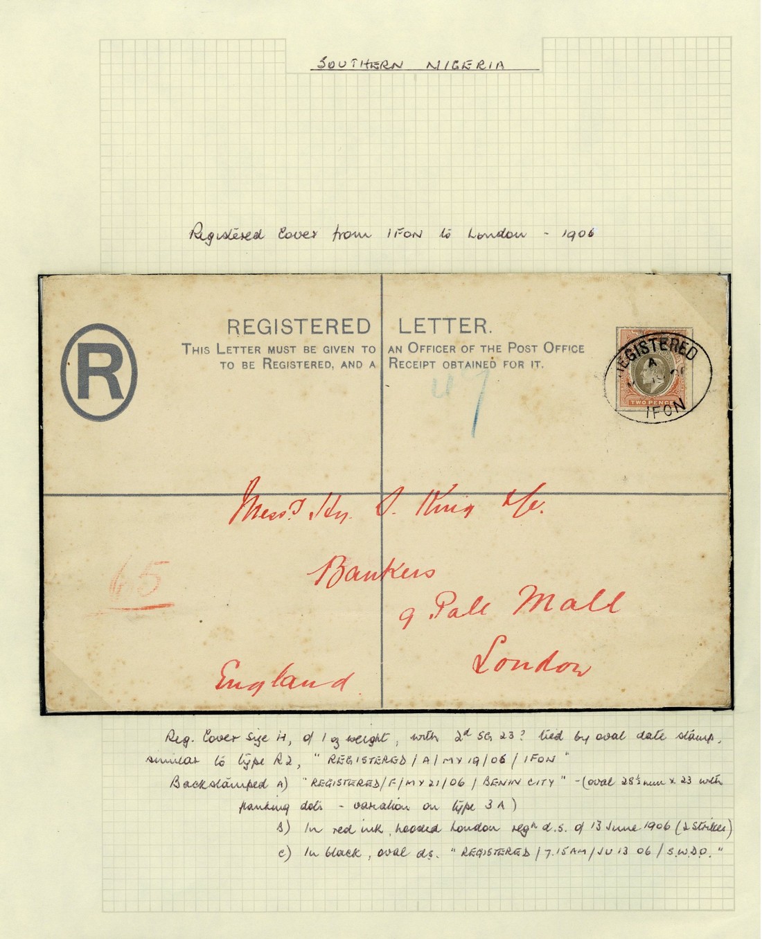 1908-11, a group of registered envelopes to internal and external destinations which includes some better postmarks including Arochuku, Ebute Metta, Epe with manuscript registration, Ifon registered oval on larger size envelope, 1910 (4 Jan.) Oyo with a superb strike of the boxed registered handstamp type R5 (the earliest recorded date) and Uyo; condition is a little mixed, a useful lot. (6 covers)