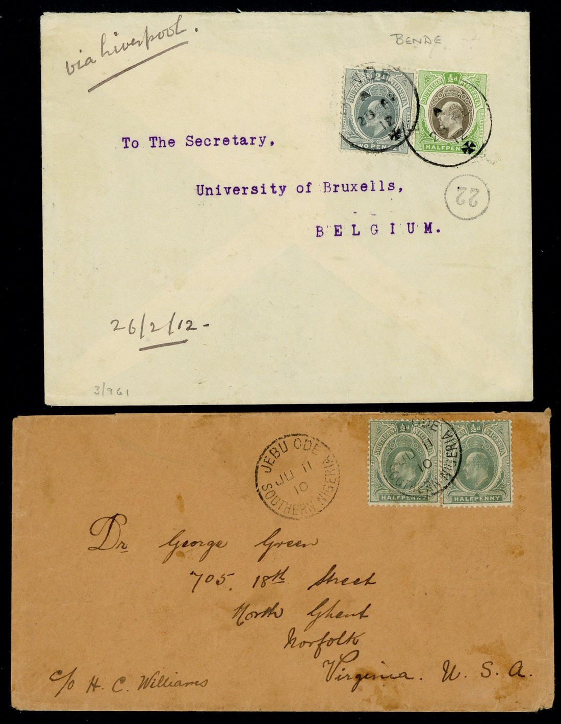 A very useful selection of covers and cards with many smaller Post Offices including Afikpo, Asaba, Badagry (3), Bende, Creektown (2), Enitsha, Ebute Metta, Ibadan plus two picture postcards, Ida, Igbein Hill (6), Okot Ekpene, Ilecha, Ishan, Jebu Ode, Lucaya, Ogbomosho, Okigwi, Oshogbo (3), Owerri, Ibadan (2), Shagamu, and Siloko; condition as a little mixed in places. (35 covers)