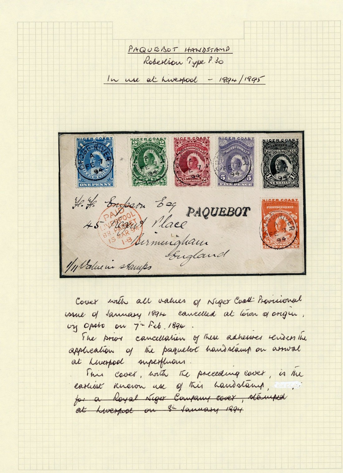 1894 (7 Feb.) envelopes (2, one stained) to Birmingham, bearing 1892 ½d. to 1/- set of six and 1894 (Jan.) ½d. to 1/- set of six respectively, all cancelled by "opobo river" c.d.s. and both showing unframed "paquebot" h.s. and Paid Liverpool Br Packet c.d.s. in red