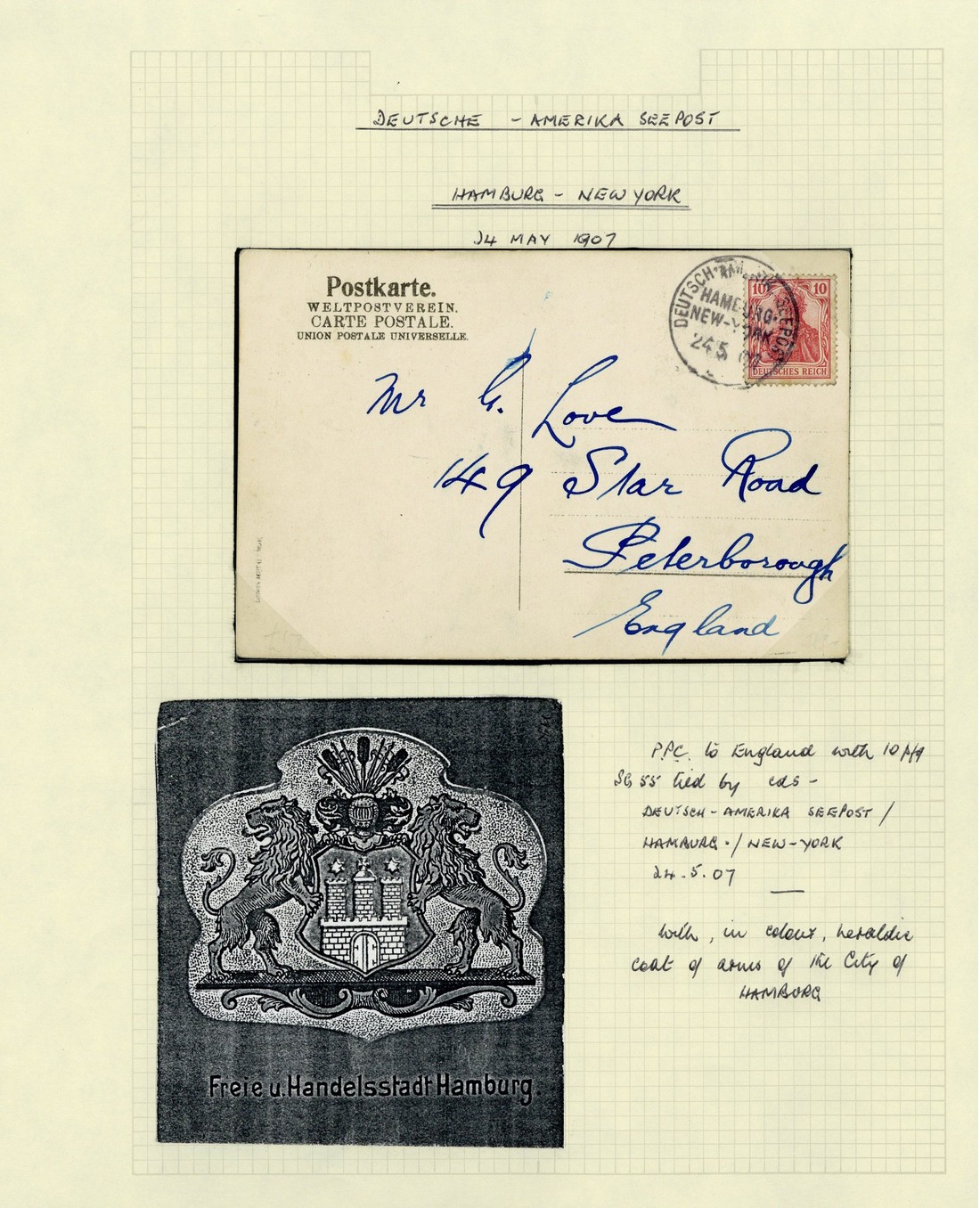 1896 (22 June) Lagos 2d. registered envelope from Lagos to USA, bearing 2½d. (faults) tied by oval of bars and showing, on reverse, despatch c.d.s. and "deutsche-amerikanische seepost/bremen-/new york" oval d.s. (14.7); also 1907 (24 May) postcard to England, bearing German 10pf. tied by "deutsche-amerika seepost/hamburg/new-york" c.d.s. and 1914 (9 Jan.) envelope to Berlin, bearing German 5pf pair tied by "kais. deutsche/marine/schiffspost/no 47" c.d.s.