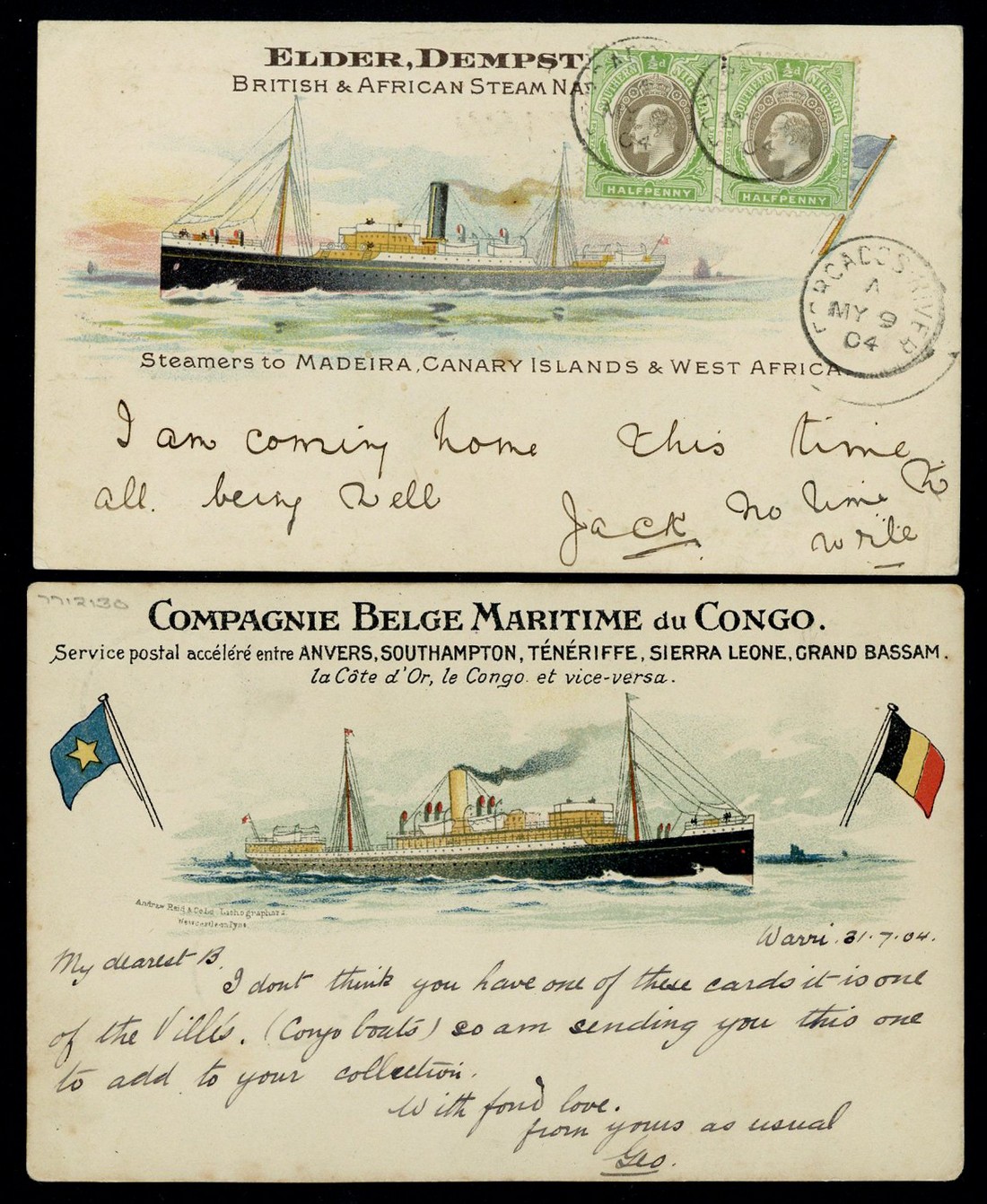 1903 (23 Feb.) and 1904 (9 May) coloured "elder, dempster & co" picture postcards (the former with heavy central vertical crease) from Addah and Forcados River to England, the former bearing Niger Coast 1d. and the latter Southern Nigeria ½d. pair tied by Forcados River c.d.s.; 1904 (2 Aug.) coloured "compagnie belge maritime du congo" picture postcard from Warri to Southampton bearing Southern Nigeria 1d.; 1904 (19 June) picture postcard from Lagos to Liverpool showing "s.s. aro" h.s. in violet on picture side and bearing GB 1d. tied by "paquebot/plymouth" c.d.s., 1907 (23 Feb) envelope (addressee's name excised and with pinholes) from Lagos to London, bearing Southern Nigeria 1d. and showing "salved from/s s jebba" h.s. in violet; also 1904 (Oct.) picture postcard of Lagos Lighthouse from Lagos to France bearing 1d. A good lot