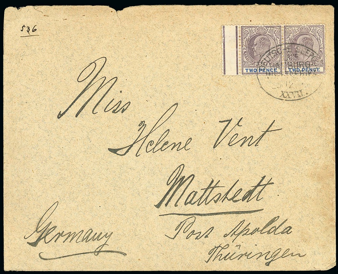 1905 (23 Dec.) envelope to Germany, bearing Lagos 2d. pair tied by "deutsche seepost/linie/hamburg-/westafrika/xxvii" oval d.s.; a few minor peripheral faults. Photo