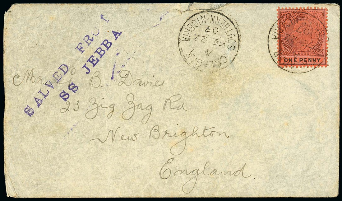 1907 (22 Feb.) envelope (with letter) to England, bearing Lagos 1d. tied by "calabar/southern nigeria" c.d.s. and showing fine "salved from/ss jebba" h.s. in violet; also photographic picture postcard of the wreck. Photo