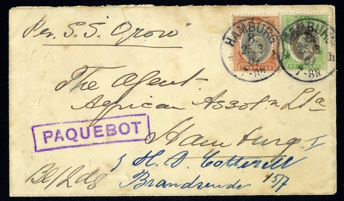 1909 (25 Mar.) envelope to Hamburg and redirected locally, marked "Per S.S. Ojoro", bearing Southern Nigeria ½d. and 2d. clearly cancelled on arrival and showing framed "paquebot" h.s. in violet; envelope with two small tears at top