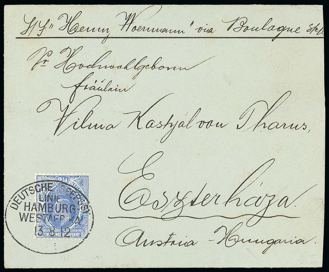 1912 (13 Aug.) envelope from Lagos to Austria, marked "S/S Henry Woermann via Boulogne", bearing Southern Nigeria 2½d. tied by fine "deutsche seepost/linie/hamburg-westafrika" oval d.s. Photo