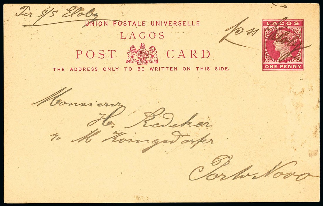 1898 (30 Jan.) Lagos 1d. stationery card to Porto Novo, cancelled by manuscript "p SS Eloby" and showing no postal markings; the card with minor fault at right. The only recorded example. Photo