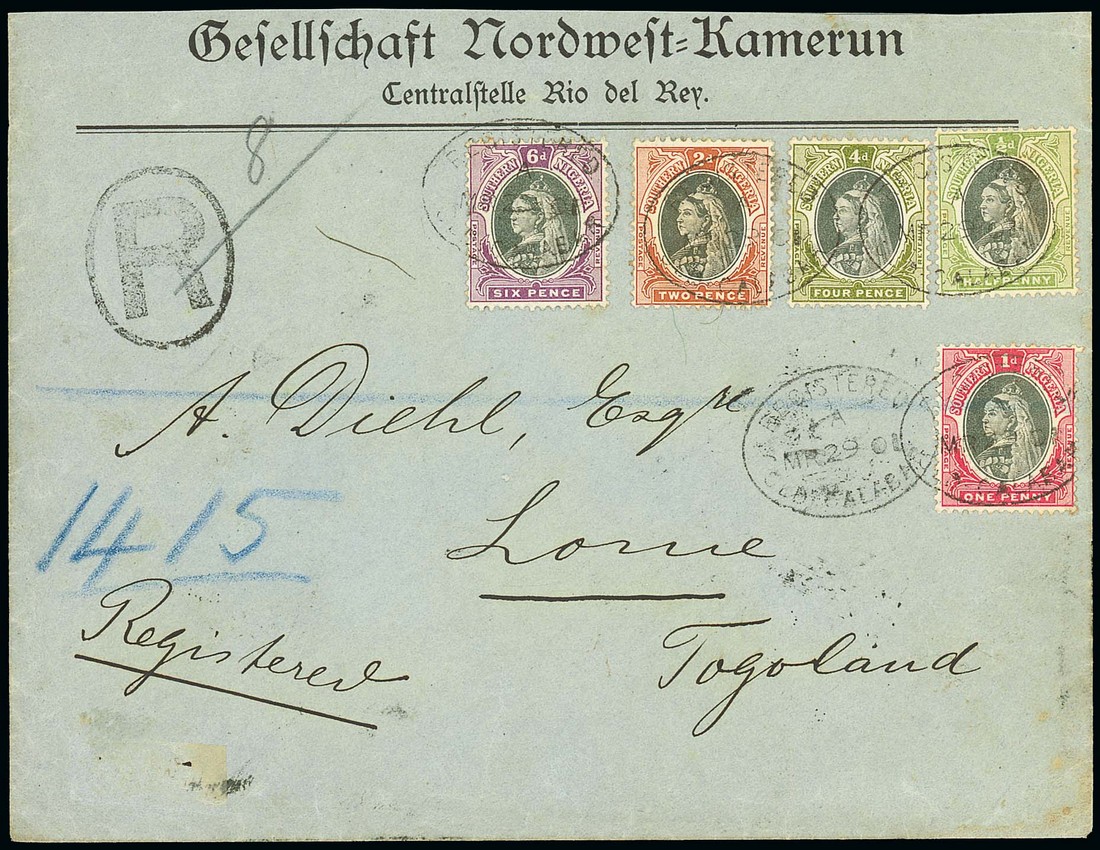 1901 (29 Mar.) "Gefellfchaft Nordweft-Kamerun" envelope registered to Togo, bearing Southern Nigeria ½d., 1d., 2d., 4d. and 6d. each tied by "registered/old calabar" d.s. (Type R6) and showing, on reverse, Lagos (9.4),Porto Novo (12.4), Cotonou (13.4), Ouidah (13.4), Popoe (14.4) and arrival (15.4) datestamps. Colourful. Photo