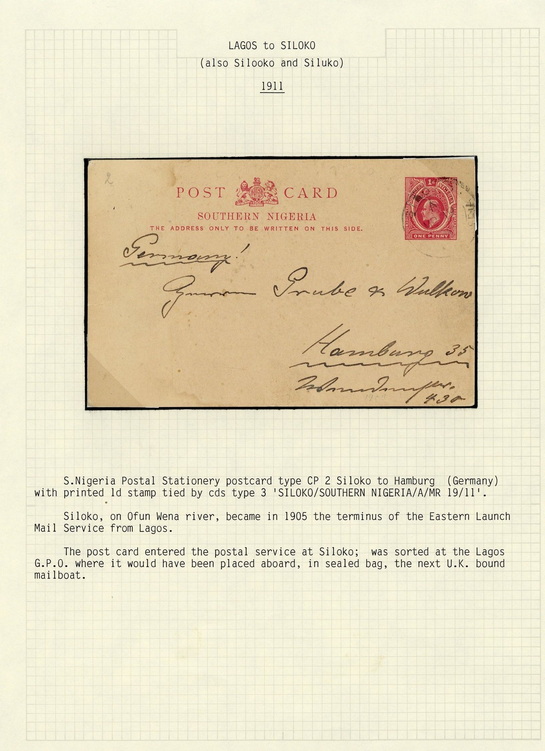 1911 (19 Mar.) Southern Nigeria 1d. stationery card to Hamburg, cancelled by legible "siloko/southern nigeria" double-ring d.s. (Type D2) and showing Lagos transit d.s. (22.3) on reverse; also1914 (12 Feb.) Southern Nigeria 1d. stationery card to Abijan, cancelled by Axim (Gold Coast) double-ring d.s., showing Half Assine and arrival datestamps alongside