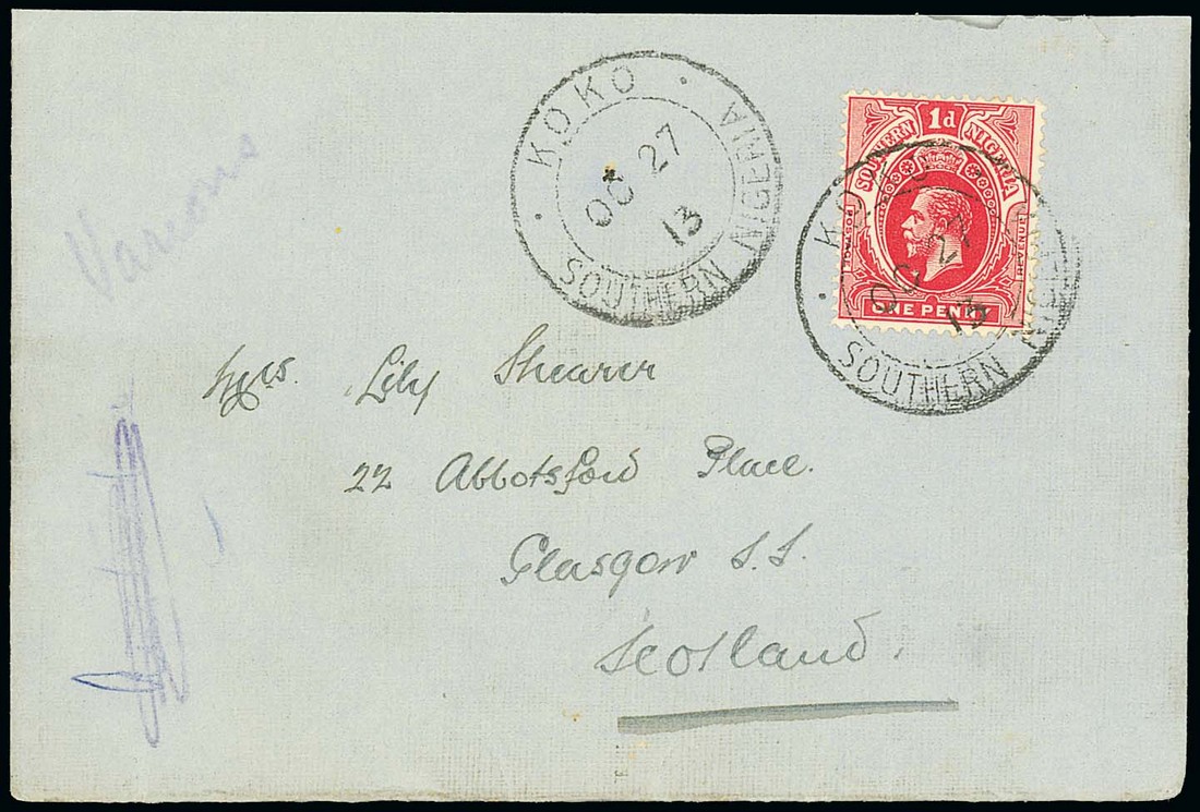 1913 (27 Oct.) envelope to Scotland, bearing Southern Nigeria 1d. tied by "koko/southern nigeria" double-ring d.s. (Type D6) with another strike alongside and showing, on reverse, "siluko/via sapele" black wax seal and Forcados c.d.s. (28.10). Photo