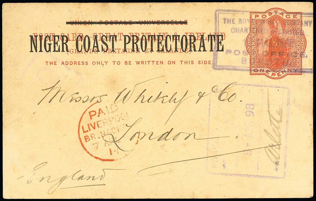 1898 (23 Feb.) 1d. stationery card to London with message headed "Gana Gana, The NIger Territories, W. Coast Africa, via Forcados", clearly cancelled by framed "thye royal niger company/chartered & limited/post office/burutu" d.s. (S.G. Type 6) in violet (12.3) and showing Paid Liverpool Br Packet c.d.s. in red (7.4); the card a little soiled. Photo