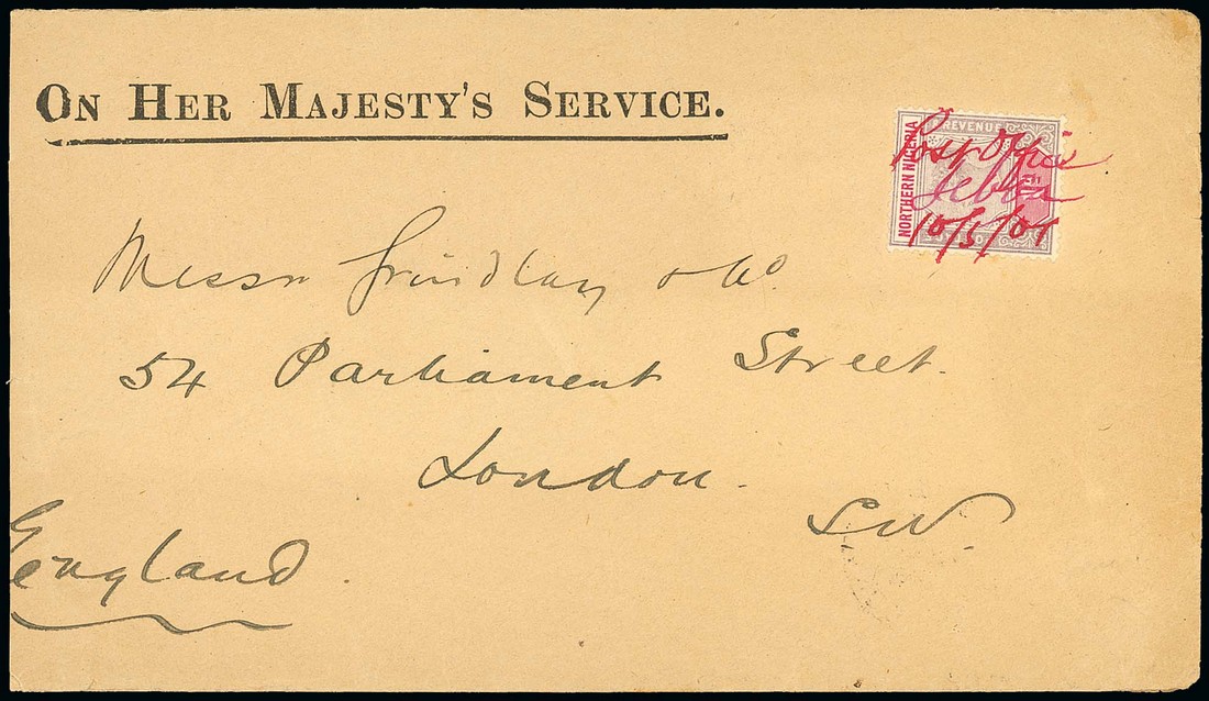 1901 OHMS envelope (slightly truncated at left) to London, bearing Northern Nigeria 1d. placed sideways and tied by manuscript "Post Office Jebba 10/5/01" and showing arrival c.d.s.(10.6) on reverse. Photo