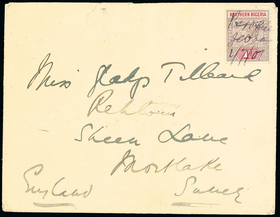 1901 envelope to Surrey, bearing Northern Nigeria 1d. cancelled by manuscript "Post Office Jebba 1/7/01" in violet ink (rare) and showing, on reverse, Lokoja (6.7) and arrival (1.8) datestamps; the envelope with tear at top caused through opening and light central vertical fold. Photo