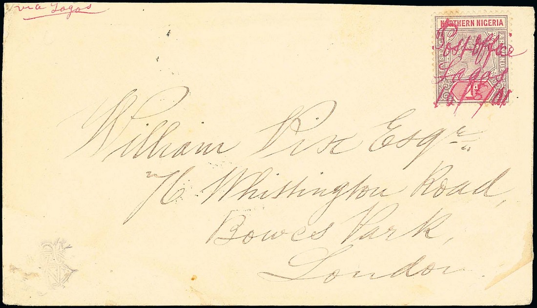 1901 envelope to London, marked "via Lagos", bearing Northern Nigeria 1d. tied by manuscript "Post Office Lagos 16.8.01" in red ink and showing, on reverse, "lagos/w.africa" c.d.s. (28.8). The manuscript handwriting appears to be very similar to that used in Jebba; it seems likely, in view of the delay between cancellation and transit d.s., that the "Lagos" was written in error for "Jebba". Photo