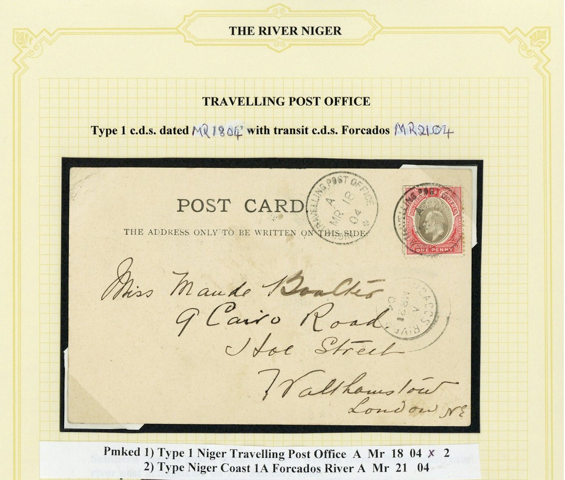 1904 (18 Mar.) picture postcard to London, bearing Southern Nigeria 1d. tied by "niger travelling post office" c.d.s. (Type D1) with another strike and Forcados (21.3) datestamp alongside. Neat and attractive