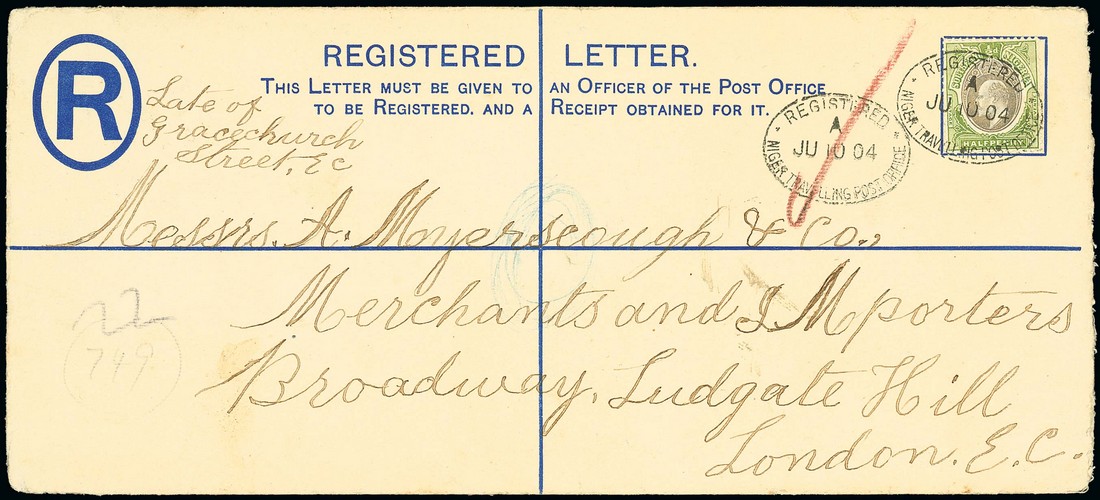 1904 (10 June) Southern Nigeria 2d. registered envelope (size H2) to London, bearing ½d. tied by fine "registered/niger travelling post office" oval d.s. (Type R1), showing another strike alongside and, on reverse, Southern Nigeria ½d. block of five just tied by arrival d.s. and showing Forcados transit d.s. A scarce and attractive item of registered mail. Photo