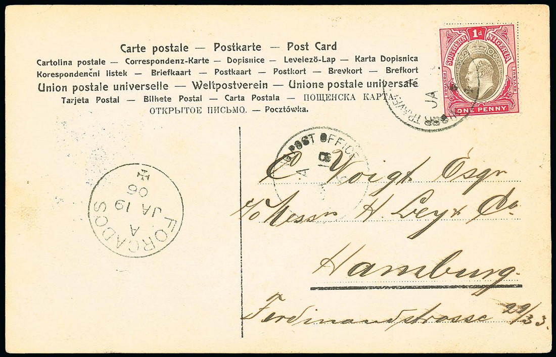 1906 (16 Jan.) photographic picture postcard written from Sagbama to Hamburg, bearing Southern Nigeria 1d. tied by "river niger travelling post office" c.d.s. (18.1) with code "A" and showing Forcados transit d.s. (19.1). Photo