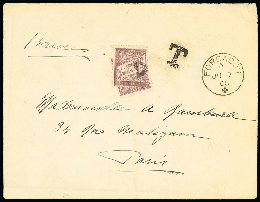 1908 unstamped envelope to Paris, with letter headed "Riviere Niger 6 Mai", showing Forcados transit d.s. (7.6), "T" h.s. and French Postage Due 50c. (2). This cover has been 5 weeks in transit and, with no Northern Nigeria stamps, a place of origin is indicated well beyond the point where the River Niger flows from Dahomey into Nigeria. Photo