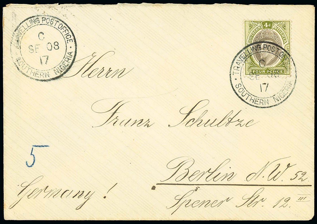 1908 (17 Sept.) envelope registered to Berlin, bearing Southern Nigeria 4d. tied by fine "ravelling post office/southern nigeria" double-ring d.s. with code "C" and showing misplaced date slugs and, on reverse, Forcados (20.9) and arrival datestamps. Photo