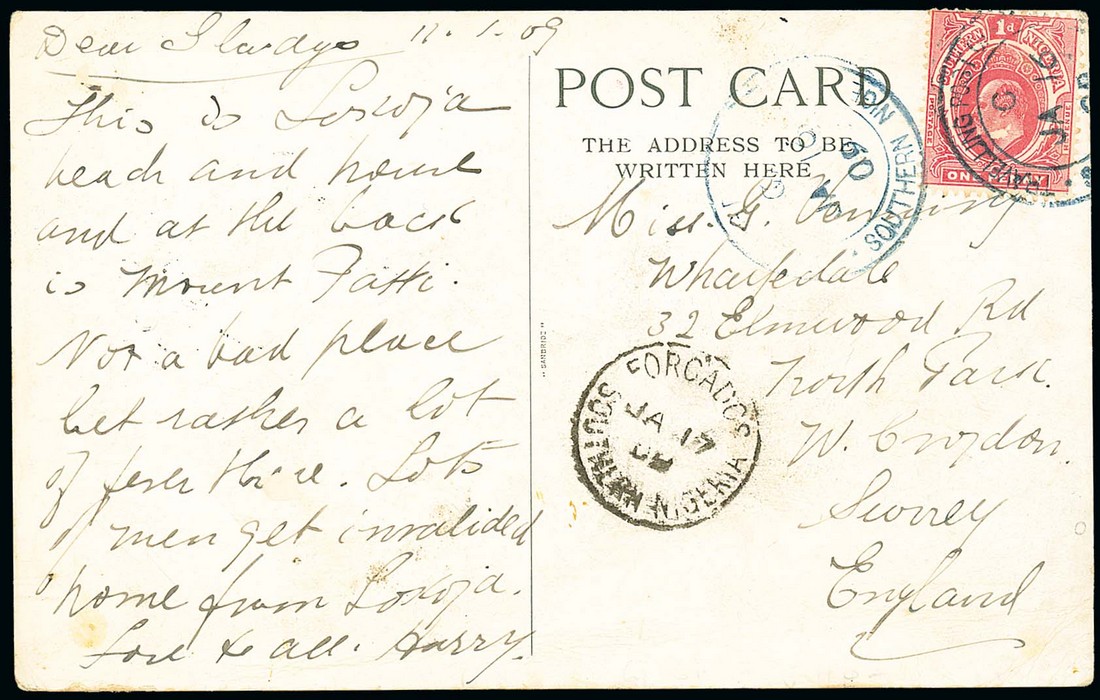 1909 (11 Jan.) picture postcard written from Lokoja to Surrey, bearing Southern Nigeria 1d. tied by "travelling post office/southern nigeria" double-ring d.s. (16.1.) with code "C" in blue (rare), showing another strike alongside and Forcados transit c.d.s. (17.1); the card with some light creases. Photo