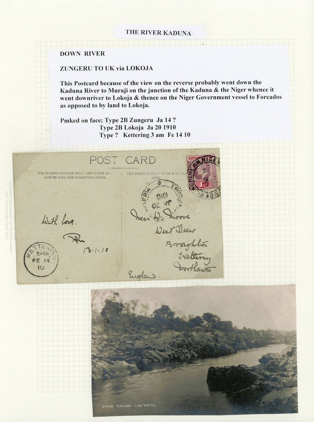 1910 (14 Jan.) photographic picture postcard ("Upper Kaduna-Low Water") to England, bearing Northern Nigeria 1d. tied by "zungeru northern nigeria" double-ring d.s. (Type D2) with Lokoja transit d.s. alongside and Kettering arrival c.d.s. (14.2) in opposite corner