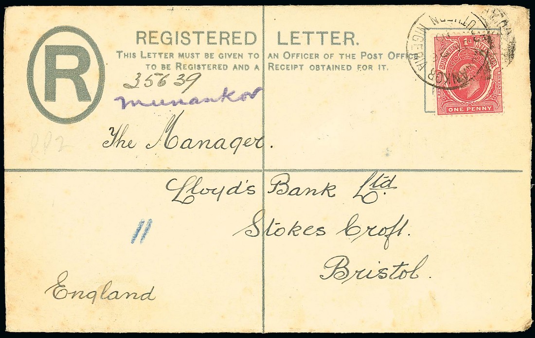 1910 (26 Jan.) Southern Nigeria 2d. registered envelope to Bristol, bearing 1d. tied by scarce "munankor/southern nigeria" c.d.s. (Type D2), showing registration marking in violet crayon and, on reverse, Forcados transit d.s. and the stamp impression cancelled in transit at Plymouth; the envelope with some minor light foxing. Photo
