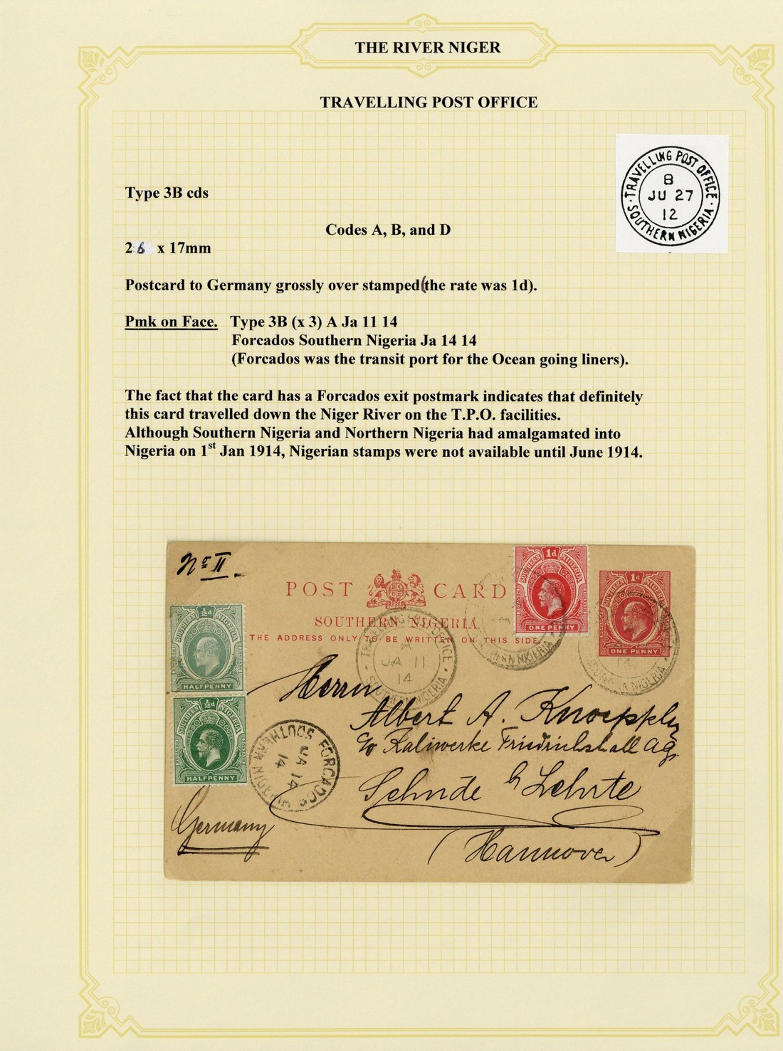 1914 (11 Jan.) Southern Nigeria 1d. stationery card to Germany, uprated ½d. (2) and 1d., the stamp impression and the 1d. cancelled by "travelling post office/southern nigeria" double-ring d.s. with code "A" and showing Forcados transit d.s.