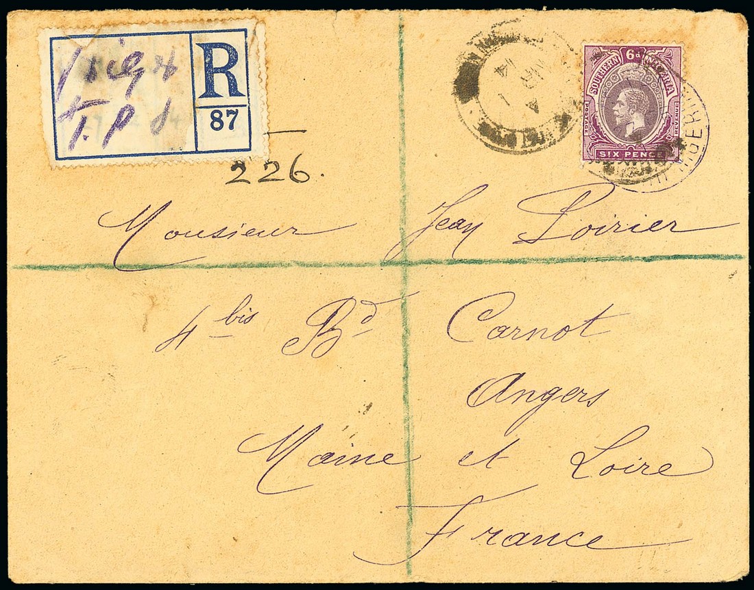 1914 (27 Feb.) envelope registered to France, bearing Southern Nigeria 6d. tied by rare "ishan/southern nigeria" c.d.s. (Type D2) in violet with another very fine strike on reverse, and showing blank registration label with violet crayon "Niger, T.P.O.". Photo