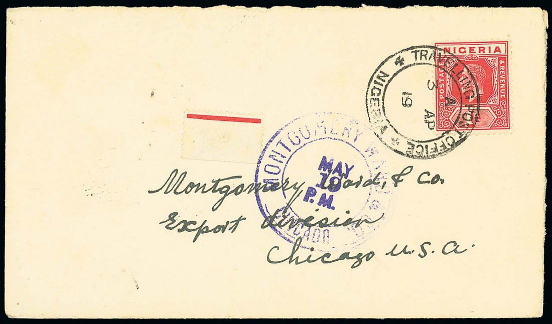 1914 (3 Apr.) "Montgomery Ward" envelope to Chicago, bearing Nigeria 1d. clearly tied by "travelling post office/nigeria" double-ring d.s. with code "A" (Type D6) and showing violet receiver's datestamp; the envelope without flap. Photo