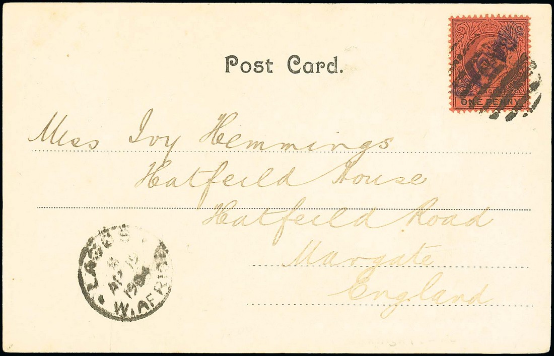 1904 picture postcard (Abeokuta) to Margate, bearing Lagos 1d. cancelled by straight-line "abadan" h.s. in violet (Type D1), tied by oval of 9 bars and showing, in opposite corner "lagos/w.africa" c.d.s. for 19 April. Very rare. Photo