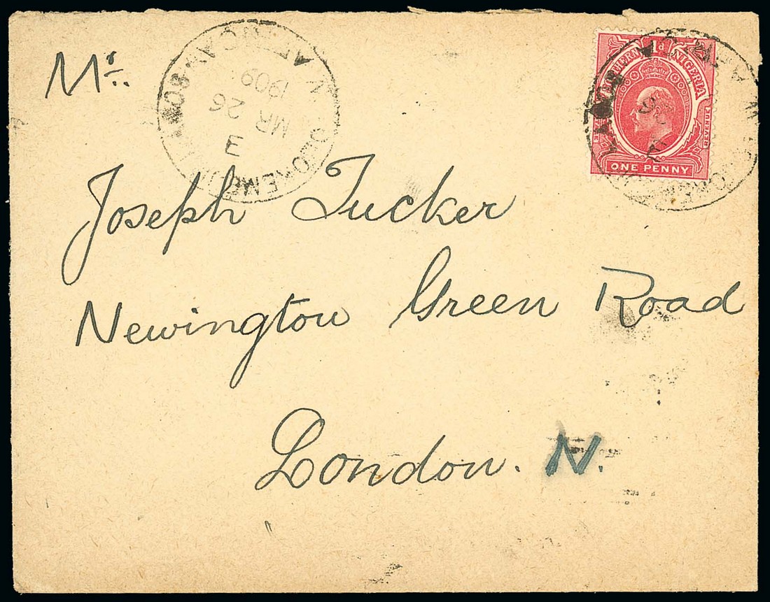 1909 (26 Mar.) envelope to London, bearing Southern Nigeria 1d. tied by "olokemeji. lagos/w africa" c.d.s. (Type D2) with another strike alongside and showing, on reverse, Lagos (26.3) and arrival datestamps; the envelope with light overall discolouration. Photo