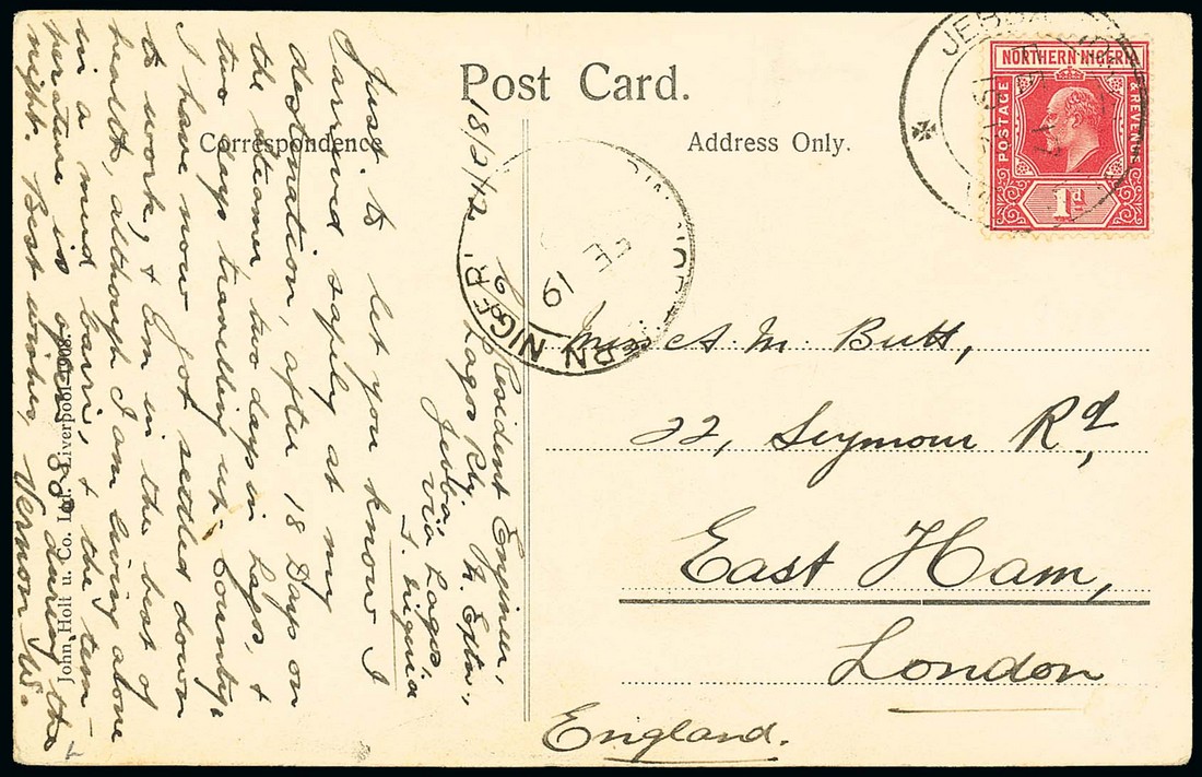 1912 (17 Feb.) picture postcard to London, from Resident Engineer, Lagos Railway N. Extension, bearing Northern Nigeria 1d. tied by "jebba northern nigeria" double-ring d.s. (Type D3). Photo