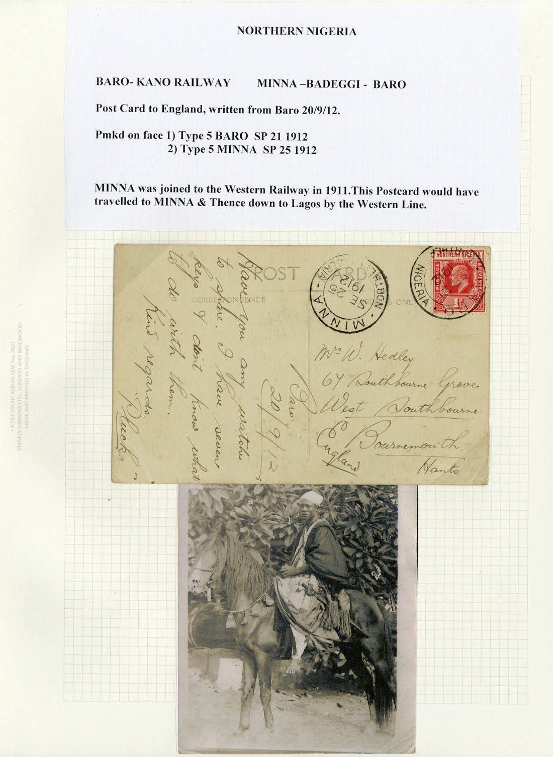 1912 (21 Sept.) picture postcard to Bournemouth, bearing Northern Nigeria 1d. tied by scarce "baro/northern nigeria" double-ring d.s. (Type D3) and showing Minna Type D2 transit d.s. (25.9) alongside; and 1915 (16 Oct.) envelope registered to England, bearing 1d. (3) tied by "baro/northern nigeria" double-ring d.s. and showing Minna transit d.s. (18.10) on reverse. A fine pair of covers