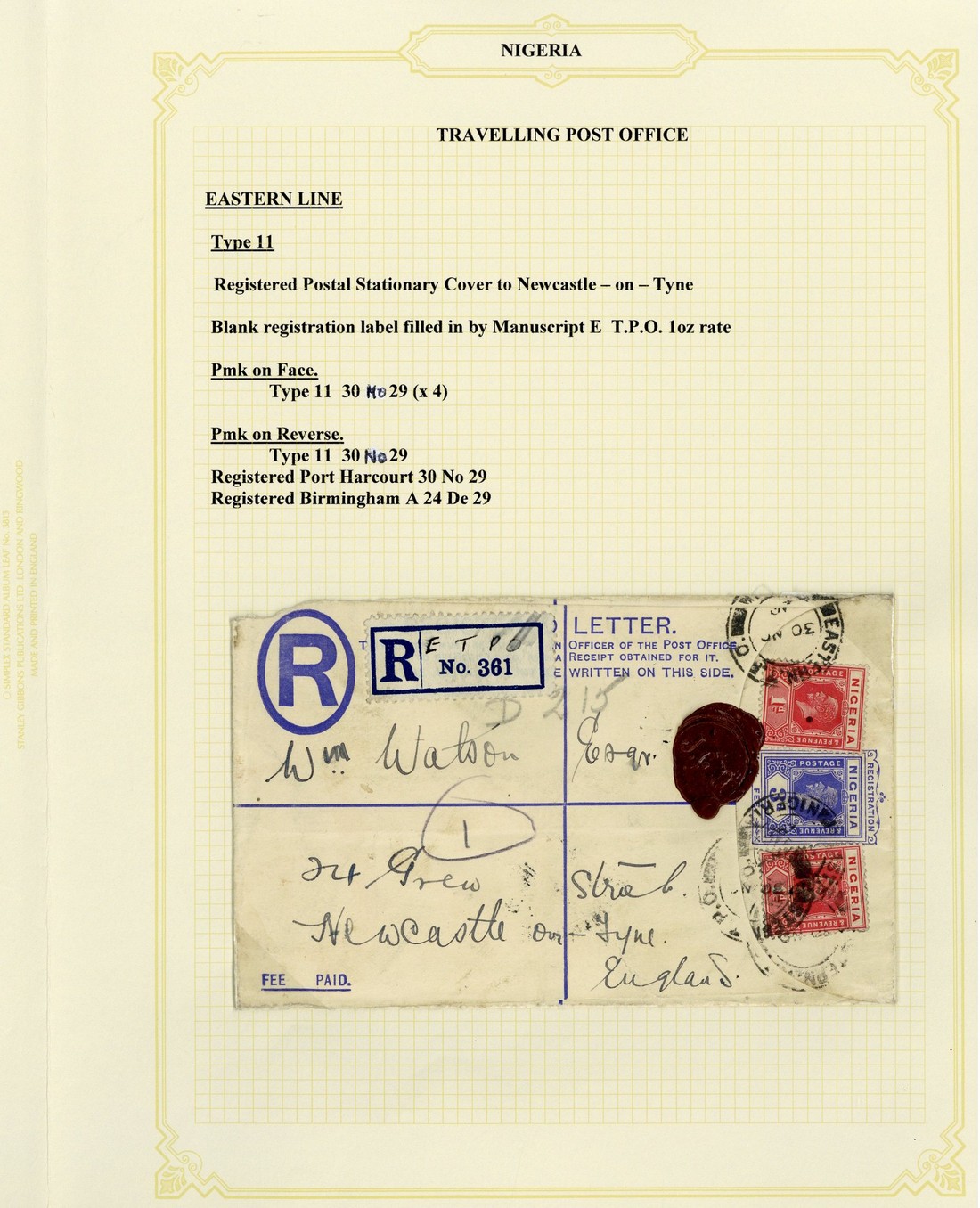 1924 (10 May) "Montgomery Ward" envelope registered from Awgu to Chicago, bearing 1d. (5) and showing manuscript "More to pay - Taxed 3d" and, on reverse, "eastern t.p.o./nigeria" double-ring d.s. (Type D2); 1926 (11 May) envelope from Umuahia to Leicester, bearing 1d., showing blue crayon "T", "2d/to pay/76" h.s. and with Postage Due 2d.; similarly backstamped; 1926 (21 June) envelope registered to Bristol, bearing ½d. (10) cancelled by "eastern t.p.o./nigeria" double-ring d.s. (Type 2) and showing blank registration with similar datestamp; 1928 (31 Mar.) envelope from Uzuakoli to Darlington, bearing 1d. and showing, on reverse, "eastern t.p.o./nigeria" double-ring d.s.; 1929 (30 Nov.) 3d. registered envelope to Newcastle, uprated with 1d. (2) cancelled by "eastern t.p.o./nigeria" double-ring d.s.(Type D2; over a month later than recorded) and showing blank registration label with manuscript "ETPO"; also six loose adhesives with part strikes of the double-ring d.s. and another with manuscript "Uzuakoli 17/2/19" overstruck with Port Harcourt c.d.s.